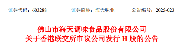 A股上市公司、内地调味品生产龙头海天味业(603288.SH),于近日公布,正在进行发行H股股票并在港交所主板上市的相关工作。港交所上市委员会于昨日举行上市聆讯,审议公司本次发行上市的申请。